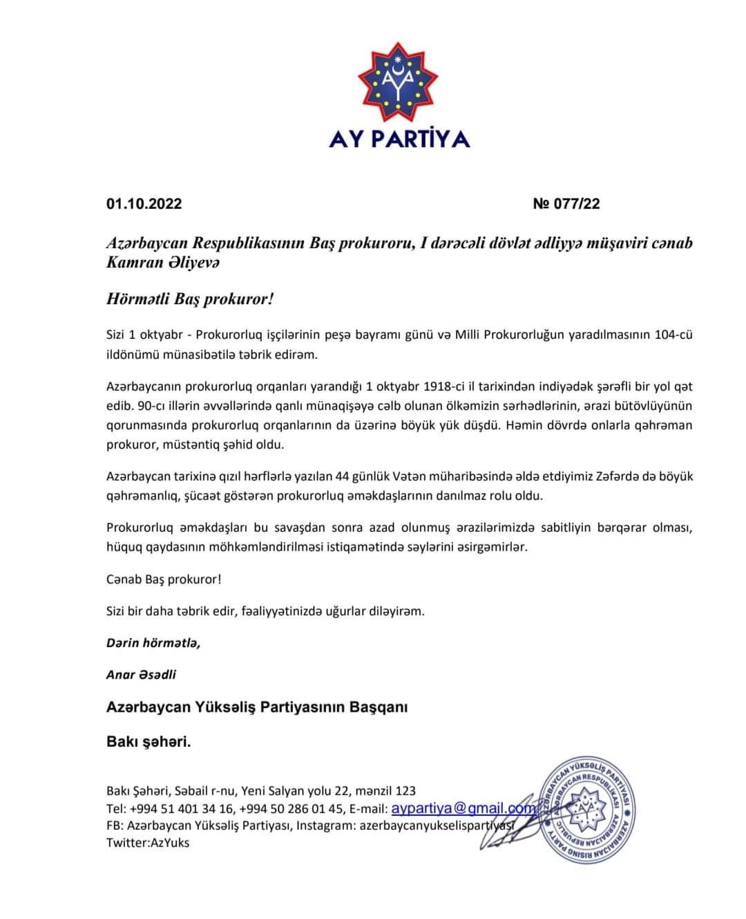 Sizi 1 oktyabr - Prokurorluq işçilərinin peşə bayramı günü və Milli Prokurorluğun yaradılmasının 104-cü ildönümü münasibətilə təbrik edirəm.