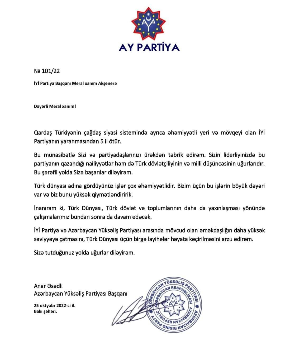İYİ Partiya və Azərbaycan Yüksəliş Partiyası arasında mövcud olan əməkdaşlığın daha yüksək səviyyəyə çatmasını, Türk Dünyası üçün birgə layihələr həyata keçirilməsini arzu edirəm.
