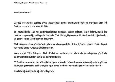 Bu münasibətlə Sizi və partiyadaşlarınızı ürəkdən təbrik edirəm. Sizin liderliyinizdə bu partiyanın qazandığı nailiyyətlər həm də Türk dövlətçiliyinin və milli düşüncəsinin uğurlarıdır. Bu şərəfli yolda Sizə başarılar diləyirəm.