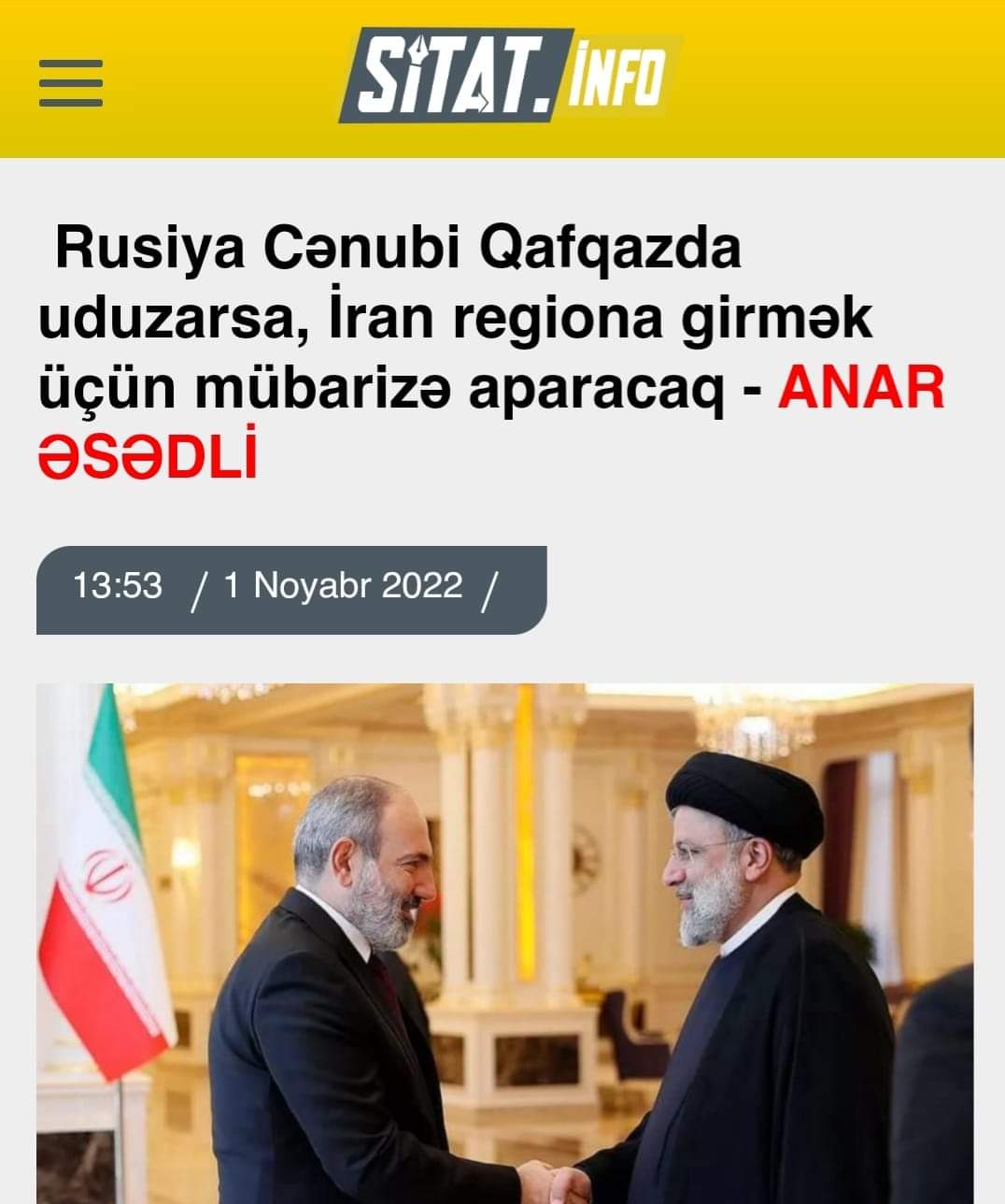 Onun sözlərinə görə, müddət öncə İranın ali dini lideri Ayətullah Əli Xameneinin Türkiyə prezidenti Rəcəb Tayyib Ərdoğanla görüşdən sonra Qarabağla bağlı paylaşdığı tvit isə əslində rəsmi Tehranın Ermənistanın tərəfində olduğunun açıq şəkildə elanı idi: "Məlumdur ki, Qarabağın ətrafı, Zəngəzur dəhlizi ilə bağlı Azərbaycan və Ermənistan, Azərbaycan və İran, eləcə də ABŞ və Rusiya arasında müəyyən fikir ayrılıqları var. Bu və Azərbaycanın verilən təminatların yerinə yetirilməsini tələb etməsi mövcud vəziyyəti xeyli gərginləşdirib, hətta müharibə ritorikası həddinə çatdırıb.